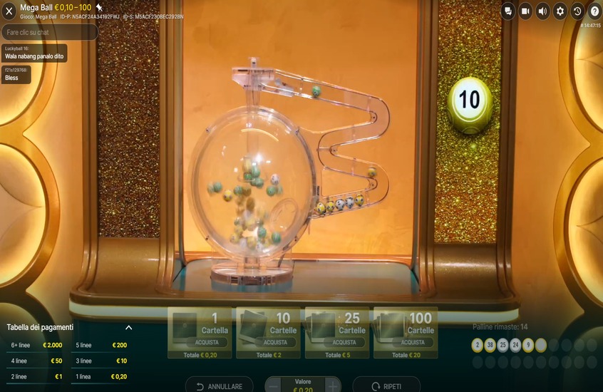 Completamento delle Linee: L’obiettivo principale di Mega Ball Live è completare le linee sulla cartella, simile al bingo tradizionale. Queste possono essere orizzontali, verticali o diagonali. Più linee si completano, maggiori sono le probabilità di vincere.
