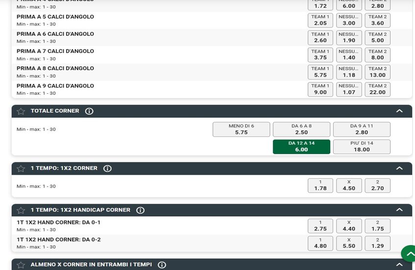 All’interno di questo mercato, la dicitura “Totale Corner 14” indica una previsione precisa sul conteggio complessivo di tiri dalla bandierina che verranno battuti durante una partita. In questo caso specifico, il riferimento a un totale di 14 ottenuti sommando quelli di entrambe le squadre nei tempi regolamentari.