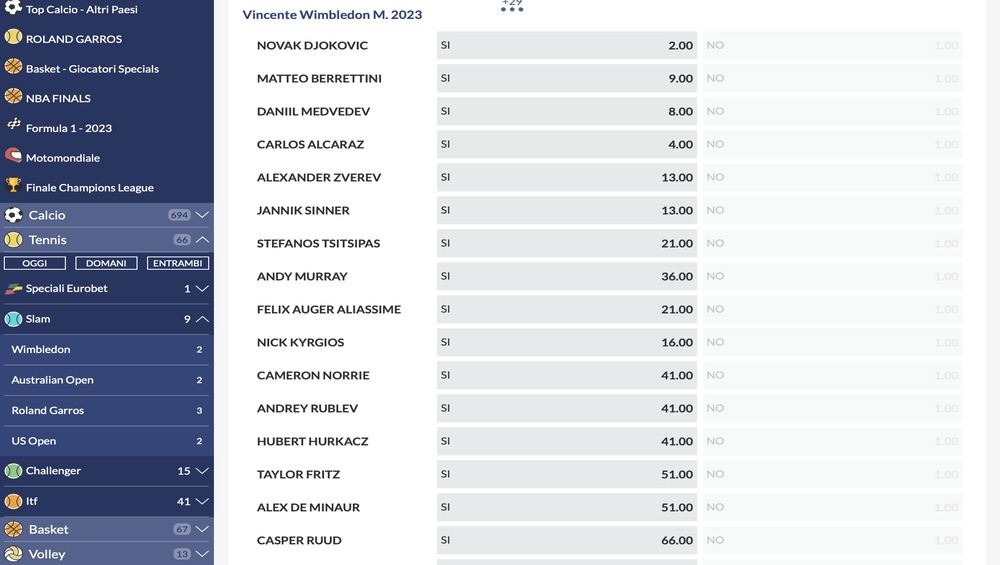 Nella foto possiamo osservare al momento della pubblicazione della nostra guida il Bookmaker Eurobet che ci presenta le quote dei potenziali vincitori del torneo del 2023. Come per gli altri sport anche Wimbledon necessita di una comprensione sui vari tipi di puntate e termini chiave. Una conoscenza approfondita di queste opzioni può offrire ai giocatori un vantaggio notevole, migliorando le possibilità di effettuare giocate vincenti. Le puntate testa a testa sono forse tra le più semplici e intuitive. Questa tipologia riguarda semplicemente l’esito di una singola partita, con lo scommettitore che sceglie quale giocatore ritiene che vincerà.